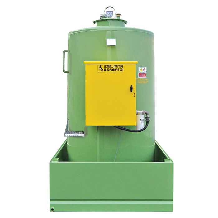 Vertikalni cilindrični spremnici s jednim zidom proizvedeni su korištenjem ljuskastih ploča i zupčastih krajeva izrađenih od ugljičnog čelika kvalitete S235JR prema UNI EN 10025. Spremnici su opremljeni spremnikom koji je dizajniran da zadrži najmanje 50% ili 100% volumena goriva za koji je spremnik projektiran. Spremnici su također opremljeni ormarićima za točenje goriva. Dostupni kapaciteti su od 975 do 9000 litara (1300, 2400, 3000, 5000, 7000).
