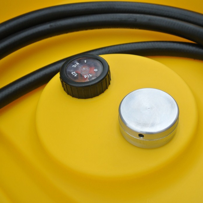 Opremljen je sljedećim elementima: ojačani poklopac na zaključavanje, aluminijski čep za punjenje s integriranim uređajem za odzračivanje, pokazivač razine, Inline filter, jedinica za prijenos goriva, automatska mlaznica za gorivo, ugrađeni džepovi viličara (pun spremnik), ručke za podizanje i nošenje (prazan spremnik) i integrirana udubljenja za pričvršćivanje s remenima tijekom transporta.